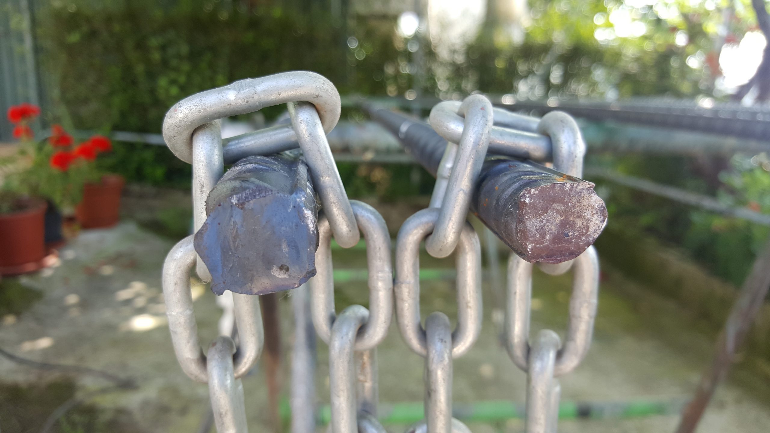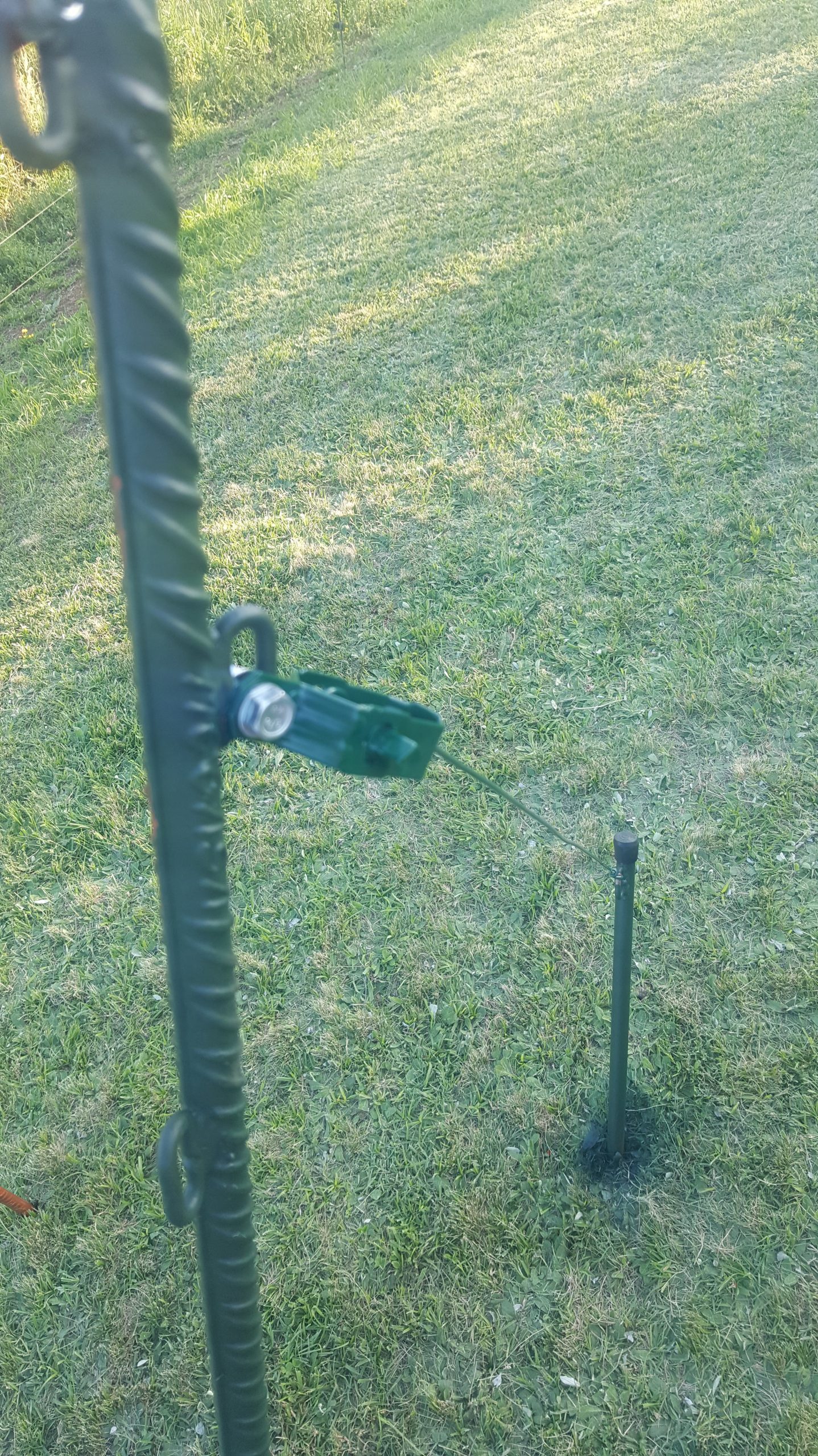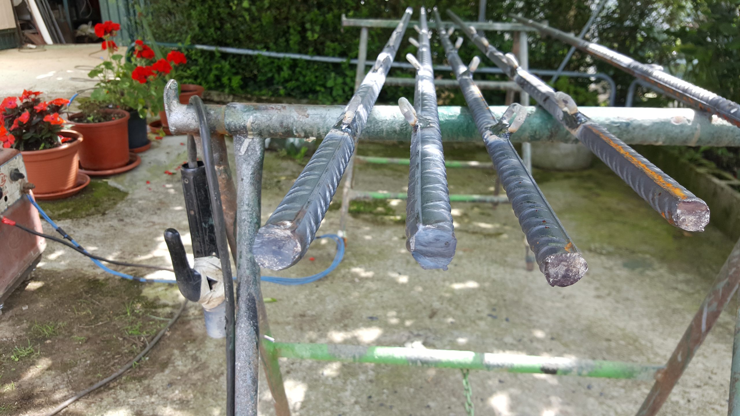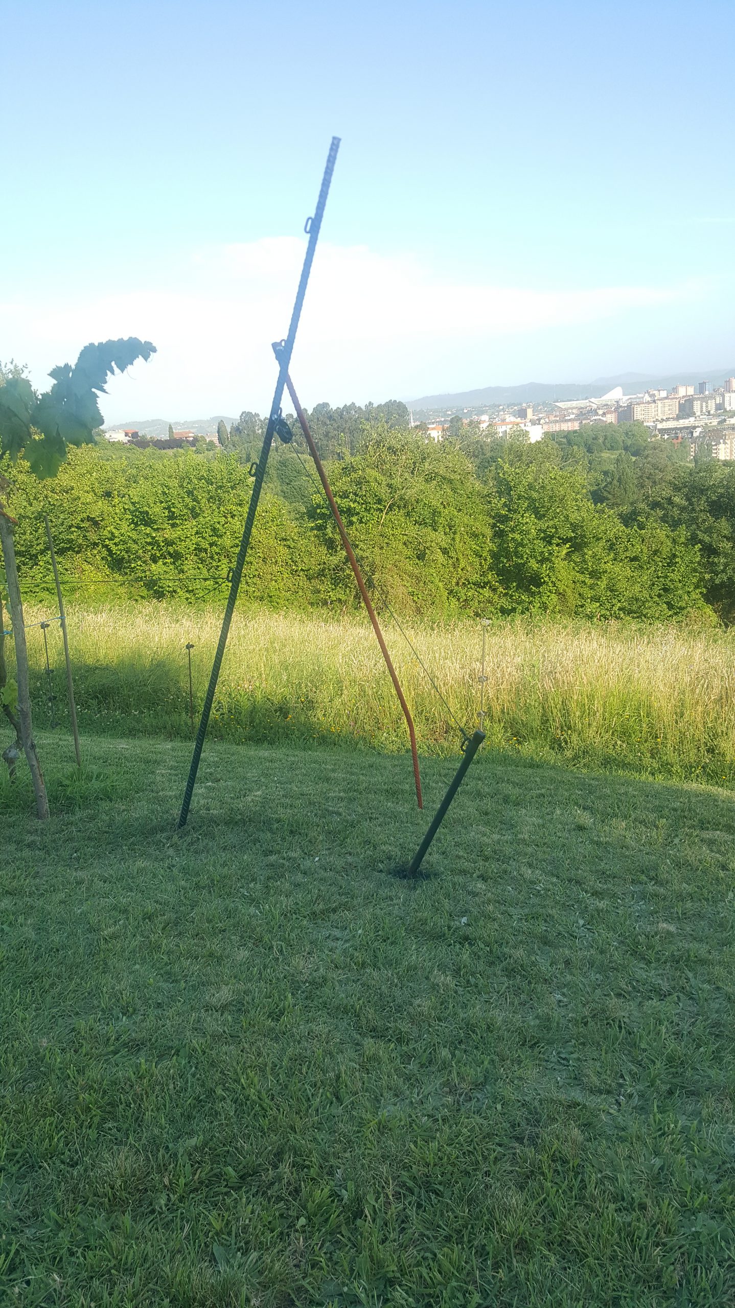 Para hacer el montaje sencillo, decido soldar una anilla a diferentes alturas de cada varilla para poder guiar el cable (a 90cm, a 120cm, a 150cm y a 180cm del suelo) y otra a mitad de la varilla en los extremos para colocar un tensor que garantiza que la línea no se afloja al pisar la tierra o por las inclemencias del tiempo (por ejemplo el viento).